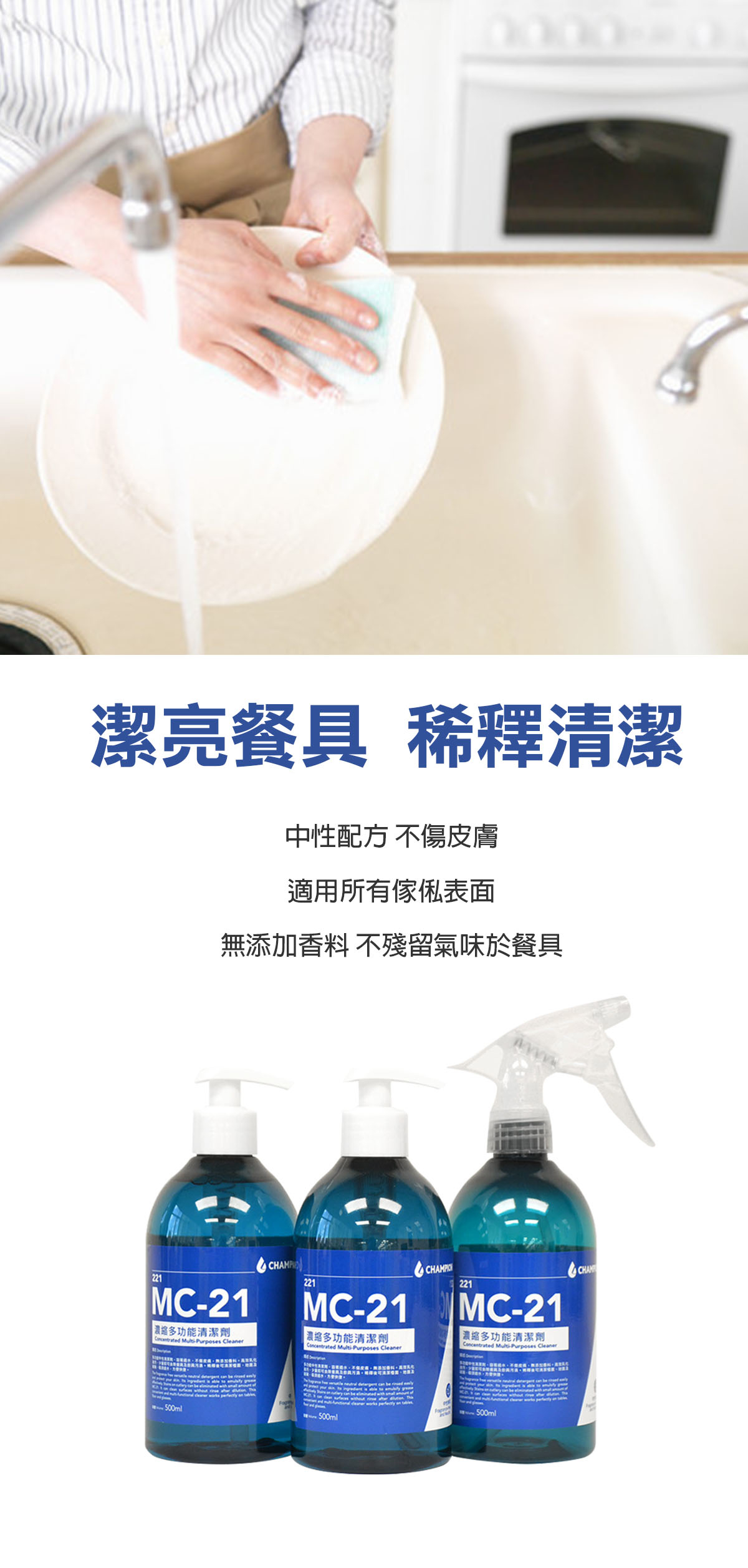 洗碗︰按一至兩下MC-21於百潔布上,刷洗餐具後洗淨