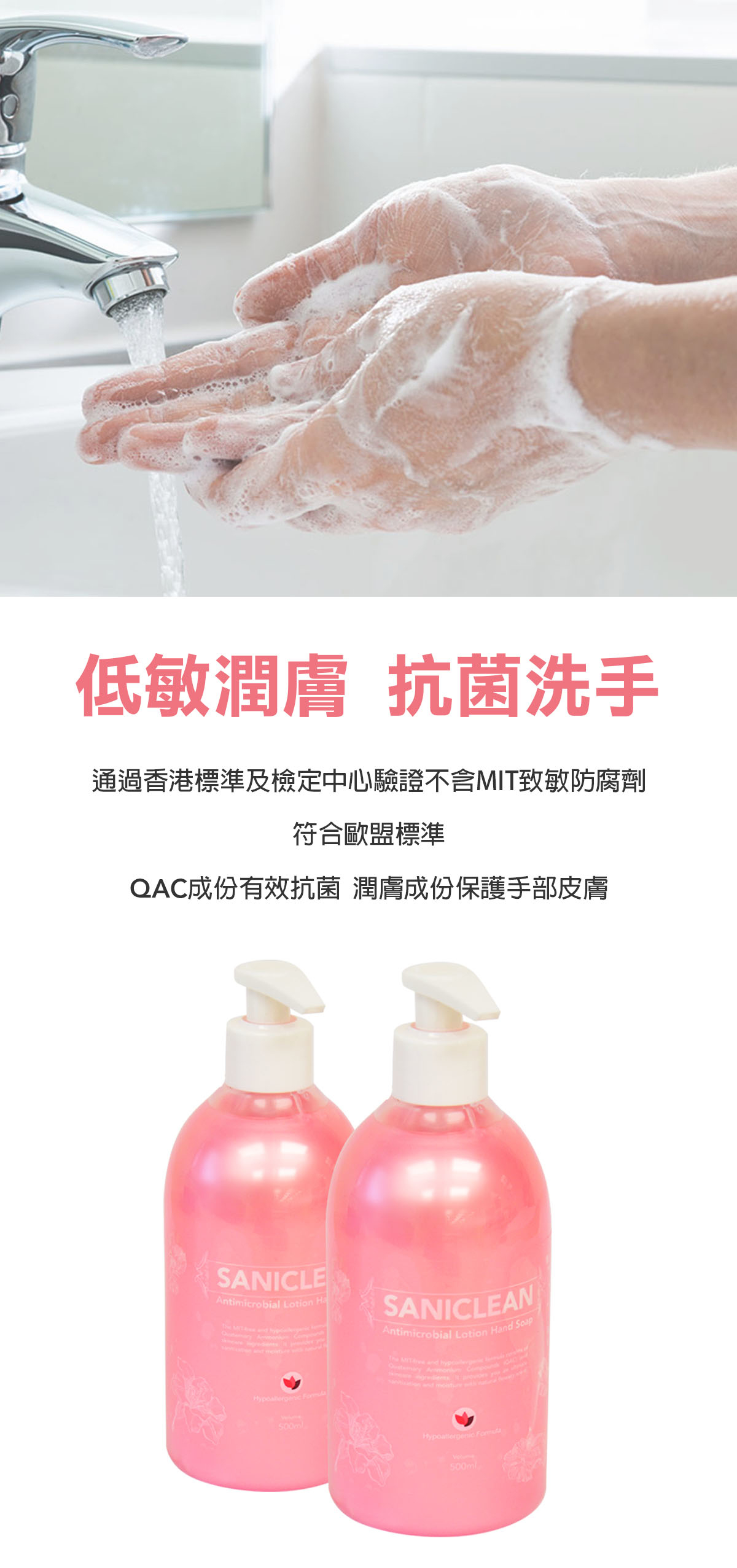 QAC 成份有效抗菌,潤膚成份保護手部皮膚